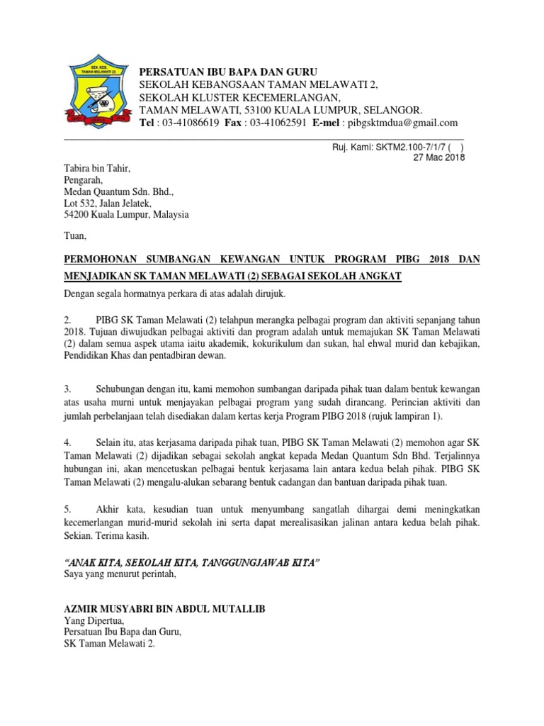 Surat Permohonan Kewangan Dan Sekolah Angkat Kepada Korporat Pdf